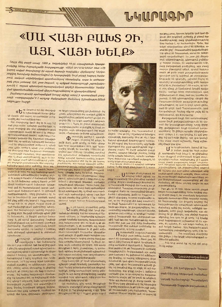 – Այդ հարցերի մասին պետական, ոչ պետական, կուսակցական մամուլն այնքան է խոսել, որ իմ խոսելն անիմաստ եմ համարում։ Քանի որ նախ ուժերն են անհավասար՝ մի կողմից երկրի հասարակական կարծիքը ձեւավորող ողջ մամուլ եւ մյուս կողմից՝ մի անհատ, որ պիտի ընդդիմախո՞ս հանդիսանա։ Բացի այդ՝ քննություն է ընթանում, սա դատարանի քննարկելիք հարց է՝ մամուլի գործ չէ։ Այն, ինչ արվում է՝ իրավական երկրի անելիք չի։ Այդ հարցերի մասին չեմ խոսում նաեւ, քանի որ այստեղ, ըստ էության, բովանդակություն չկա էլ։ Բովանդակությունը հասարակության զուտ հոգեբանական շերտերում է գտնվում։