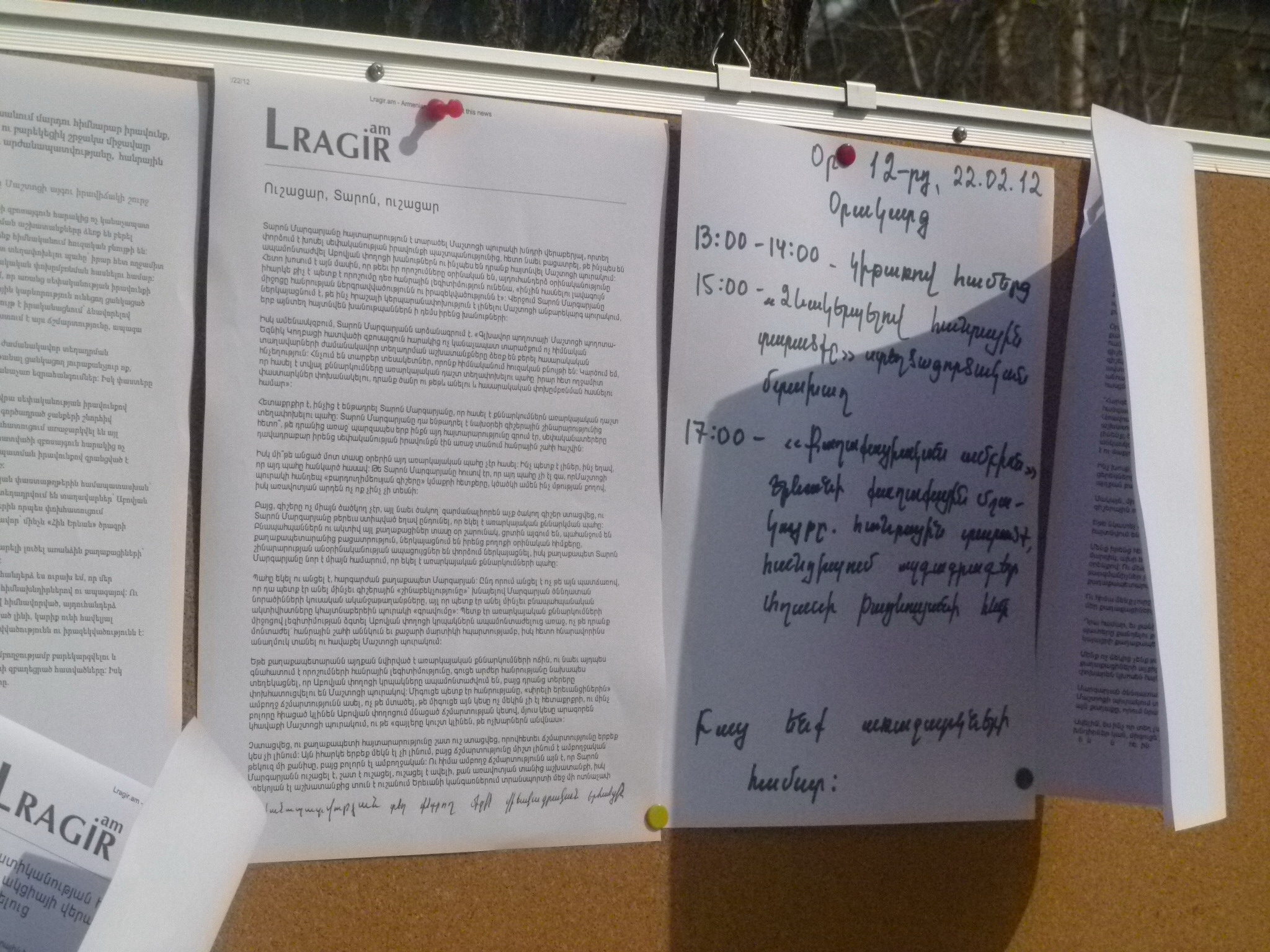 Պատին փակցված էր օրակարգը, որով առաջնորդվելու էին բնապահպանները եւ նրանց մենակ չթողնող քաղաքացիները: