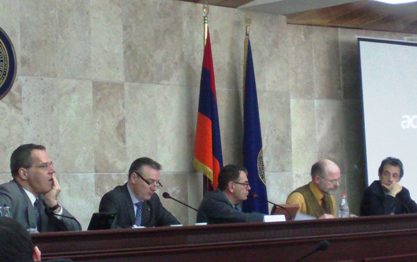 ԵՊՀ ռեկտոր Արամ Սիմոնյանը, ուսանողներին ներկայացնելով ֆրանս-գերմանական երկխոսության կարեւորությունը, ասաց. «Երկու երկրների ժողովուրդների հարաբերությունները կարեւոր են տարբեր տարածաշրջանների, այդ թվում` Կովկասյան տարածաշրջանի համար: Կարող է թվալ, թե ֆրանսգերմանական հաշտեցումը եւ հետպատերազմյան Եվրոպայում տեղի ունեցած հարաբերությունների կանոնավորումը քիչ առնչություն ունի Կովկասի ժողովուրդների հետ: Դա այդպես չէ այն պատճառով, որ ֆրանս-գերմանական հարաբերությունների կարգավորման խնդիրը ցույց տվեց աշխարհին, թե ինչպես երկու ժողովուրդներ եւ երկրներ, որոնք դարավոր խնդիրներ են ունեցել իրար հետ, կամք ու գիտակցում ունեցան խնդիրը լուծելու համար»: