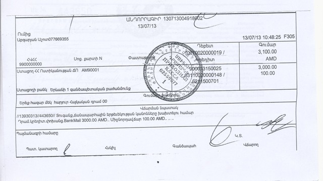 Վարորդ Աբգարյանը համաձայն լինելով իր կատարած խախտման հետ՝ պարտաճանաչ տարել եւ բանկում վճարել է 3000 դրամ տուգանքը (առկա է վճարման անդորրագիրը)՝ մտածելով, որ Ճանապարհային ոստիկանության հետ այլեւս պարտք ու պահանջ չունի: Ակտը կազմել է Ճանապարհային ոստիկանության 1-ին գումարտակի տեսուչը: Չանցած մի քանի օր՝ Ճանապարհային ոստիկանությունից վարորդի նույն խախտման համար մեկ այլ ծանուցում է ուղարկվել՝ այս անգամ նույն խախտման չափը ֆիքսած 5000 դրամ: Պարզվել է՝ «OPEL»-ի վարորդի խախտումն արձանագրել է նաեւ Կոմիտասի փողոցի Վրացական խաչմերուկի հատվածում տեղադրված տեսախցիկը: Ուշագրավ է, որ նույն խախտման համար խախտումների արձանագրման կենտրոնի տեսուչ Սաթենիկ Մկրտչյանը գտել է, որ վարորդը պետք է տուգանվի 5000 դրամով: Ընդ որում, տեսուչ Մկրտչյանը խախտումը հիմնավորել է օրենքի նույն հոդվածով, ինչը՝ տեսուչ Ղազարյանն՝ իր կազմած ակտում: