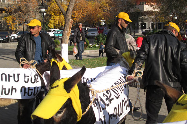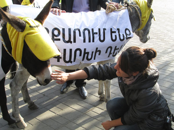 Այսօր հերթական զավեշտալի իրադարձությունը եղավ Մաշտոցի պուրակում: «Ազատագրենք հուշարձանն օլիգարխից» նախաձեռնության հերթական ակցիայի ժամանակ՝ ակտիվիստների խորհրդանիշ դեղին գլխարկներով մի խումբ երիտասարդների ուղեկցությամբ ավանակները միացան ակցիային: Սա, իհարկե, առաջին դեպքը չէր, երբ կենդանիներն էլ էին պայքարում օլիգարխի դեմ: Օրեր առաջ դեղին գլխարկներով այծերն ու ոչխարներն էին միացել ակտիվիստներին: