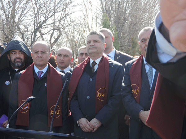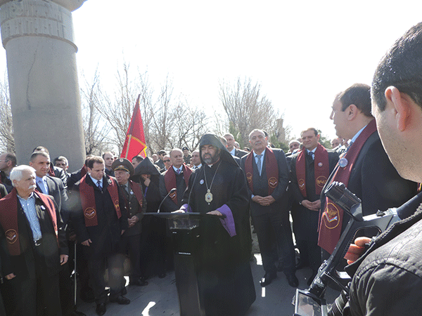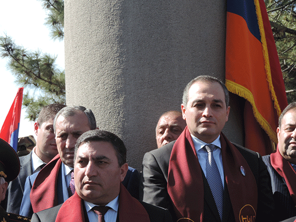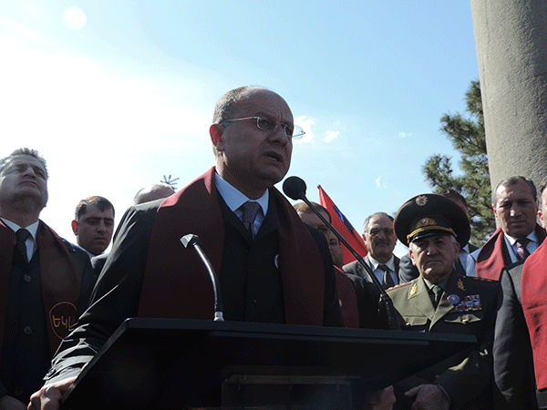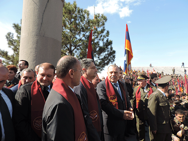 Վարչապետ Տիգրան Սարգսյանը ելույթ չունեցավ: Չխոսեց նաեւ Երեւանի քաղաքապետը: Փոխարենը հայրենասիրական ճառով հանդես եկավ ԵՊՀ պատմության ֆակուլտետի դեկան Էդիկ Մինասյանը, ով լայն հասարակությանը հայտնի դարձավ պատմության բուհական դասագրքերում նորագույն ժամանակների պատմության յուրովի մեկնաբանությամբ, մասնավորապես՝ Մարտի 1-ի իրադարձությունների իշխանական քարոզչության վերարտադրմամբ: Հիշատակի խոսք ասացին նաեւ Վազգեն Սարգսյանի անվան ռազմական ակադեմիայի մի սան, մի պատանի երկրապահ, ապագա զինվորի մի մայր եւ իհարկե՝ Վազգեն Սարգսյանի մարտական ընկերներից: