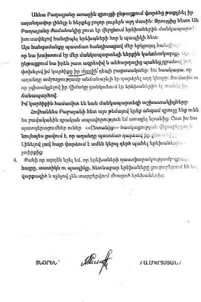 Մանկապարտեզի տնօրենի գրությունը հայցվոր կողմը մտադիր է ներկայացնել դատարան՝ որպես բնութագրություն, թե ինչպիսի մայր է Աննա Բադալյանը: Երեք երեխայի մայրը մեզ հետ զրույցի ժամանակ նշեց, որ մանկապարտեզի տնօրենն այդպիսի ատելության դրսեւորում է ցուցաբերել միայն այն պատճառով, որ նա այցելել է մանկապարտեզ՝ երեխաներին տեսակցության, իսկ իրեն արգելել են, քանի որ տնօրինությունը նպատակահարմար է գտել, որ երեխաներն ավելի անվտանգ են իրենց տատիկի ու պապիկի խնամակալության ներքո: