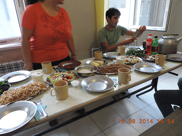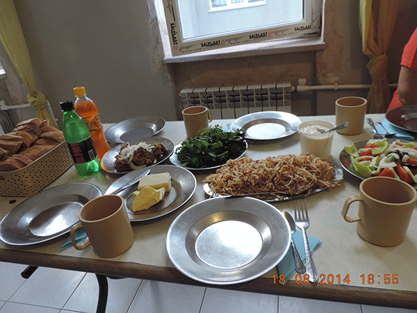 Ուսումնարանը վերանորոգվում էր, պատերն էին ներկում, դահլիճ կառուցում: Լրագրողներս ընթրեցինք եւ նախաճաշեցինք ուսումնարանի սաների համար նախատեսված ճաշարանում: Ամեն ինչ պատշաճ էր, նույնը՝ ինչ զինվորների համար: Ընթրիքին՝ վերմիշելով եւ բրնձով փլավներ, խաշած տավարի միս, պանիր, կարագ, թթվասեր, կանաչեղեն, ամառային սալաթ, հատուկ զինվորների համար արտադրված կետչուպ, թեյ, հաց, լիմոնադ եւ հանքային ջուր: Նախաճաշին՝ ձու, կարագ, պանիր, կաթնաշոռ-թթվասեր, հնդաձավարով եւ բրնձով փլավներ: Թերեւս միայն պլաստմասսայե բաժակներով թեյը՝ եռման ջրի եւ պլաստմասայի շփման արդյունքում առաջացած տհաճ համի պատճառով, չհավանեցինք: Ավելի ուշ՝ Արցախի բանակի թիկունքի պետն ասաց, որ ալյումինե բաժակները փչանում էին, այլ տեսակի բաժակներ հնարավոր չէ լինեն՝ կոտրվում են, միակ դիմացկուն եւ լավ տարբերակը այդ պլաստմասսան է: