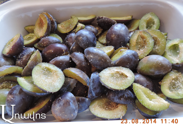 Սալորները (հարմար է ինչպես սեւ սալորը, այնպես էլ՝ ցանկացած այլ տեսակի) կորիզահանել, լցնել հրակայուն ամանի մեջ, վրան մի քիչ դարչին կամ սեւ պղպեղ անել, շաքարավազի 1/4-ը, խառնել: