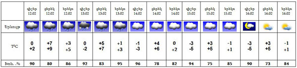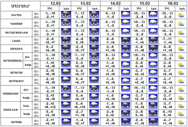 Փետրվարի 12-13-ին շրջանների մեծ մասում, 14-15-ին արևելյան շրջաններում ժամանակ առ ժամանակ սպասվում են տեղումներ, 12-ին առանձին վայրերում՝ զգալի, 16-ին սպասվում է առանց տեղումների եղանակ: