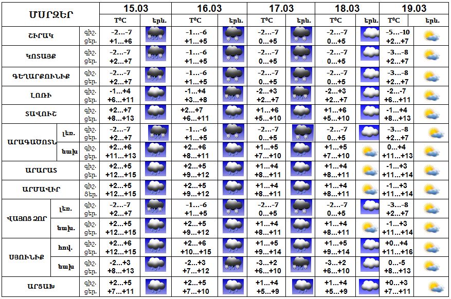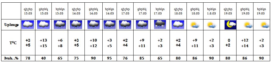 Մարտի 15-ի գիշերը, 18-ի ցերեկը, 19-ին սպասվում է առանց տեղումների եղանակ: 15-ի ցերեկը, 16-17-ին,18-ի գիշերը ժամանակ առ ժամանակ սպասվում են տեղումներ: