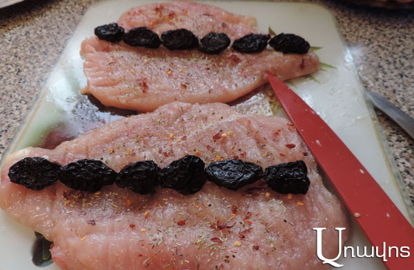 Անկորիզ սալորաչրերը մեկ շարքով երկայնակի դասավորեք կրծքամսի վրա, փաթաթեք եւ կապեք հաստ թելով: Թողեք որոշ ժամանակ հանգստանա: Եթե մինչեւ երկու ժամ եք թողնելու, կարող եք սենյակային ջերմաստիճանում պահել: Սակայն եթե ավելի երկար եք պահելու, վրան մի քիչ ձիթապտղի յուղ արեք, մեկ-երկու կտոր սխտոր դրեք, ու դրեք սառնարան: Սխտորն ու ձիթապտղի յուղը թույլ կտան մինչեւ երկու-երեք օր այդպես մնա սառնարանում: