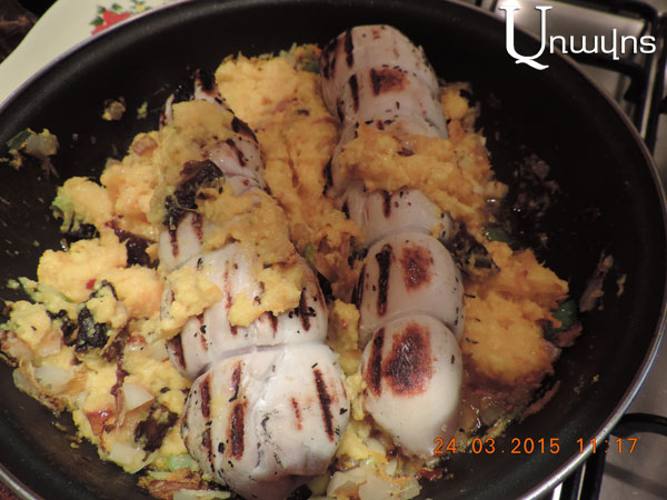 Այլ թավայի մեջ բուսական յուղով տապակեք սոխը, ավելացրեք քերած սխտորը: Կեղեւահանեք կոճապղպեղը եւ մանր քերեք, ավելացրեք սոխին եւ սխտորին: Նարինջները լավ լվացեք, կեղեւը քերեք թավայի մեջ, իսկ մնացած նարինջը կամ մսաղացով կամ էլեկտրական խառնիչով (բլենդերով) մանրացրեք: