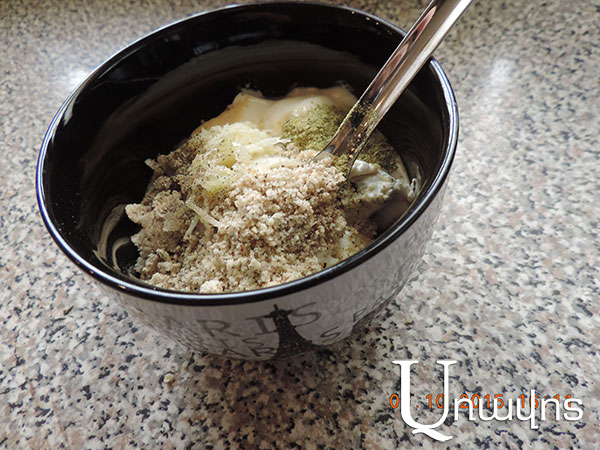 Միջուկը պատրաստելու համար թասիկի մեջ իրար խառնեք մածունը, քամած մածունը, թահինը, աղացած ընկույզը, մանրացրած սխտորը (կարող եք ճզմել, կտրատել կամ մանր անցքերով քերիչով անցկացնել), աղը, համեմունքները (օրինակ՝ սեւ եւ կարմիր աղացած պղպեղ, խմելի սունելի, համեմի աղացած սերմ, չորացրած սամիթ եւ այլն՝ ըստ ձեր ճաշակի), մանր կտրատած կանաչին (ցանկալի է՝ համեմ եւ սամիթ), նռան հատիկները: