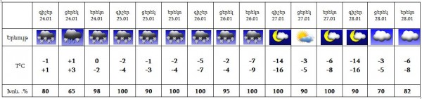 Հունվարի 24-ին սպասվում է թաց ձյուն, 25-26-ին‵ ձյուն: 27-28-ին սպասվում է առանց տեղումների եղանակ: