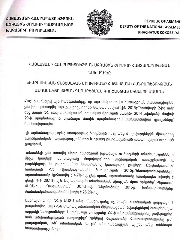 Հաշվի առնելով այն հանգամանքը, որ այս մեկ տարվա ընթացքում, փաստացիորեն, չեն իրականացվել այն քայլերը, որոնք նախատեսվում էին 2015թ․հունվարի 2-ից ուժի մեջ մտած ՀՀ՝ «Եվրասիական տնտեսական միության մասին» 2014 թվականի մայիսի 29-ի պայմանագրին միանալու մասին պայմանագրով նախատեսված դրույթները՝ մասնավորապես.