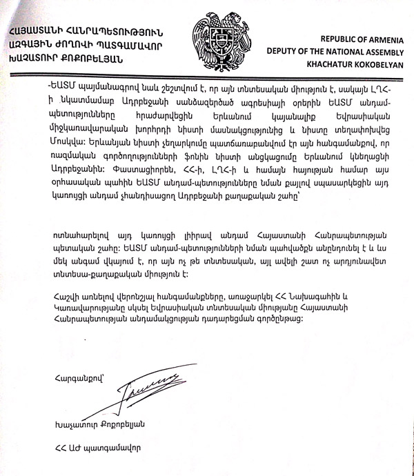 Ազատ դեմոկրատներ կուսակցության նախագահ, ՀՀ Ազգային Ժողովի պատգամավոր Խաչատուր Քոքոբելյանը՝ օգտվելով օրենքով նախատեսված ընթացակարգերից, երեկ Ազգային ժողով է ներկայացրել «Եվրասիական տնտեսական միությանը Հայաստանի Հանրապետության անդամակցության դադարեցման գործընթաց սկսելու մասին» ՀՀ ԱԺ հայտարարության նախագիծը: Կից տեսեք՝ հայտարարության նախագիծը: