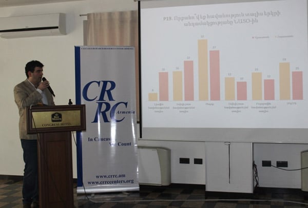 Երևան, Հայաստան: Հետազոտական ռեսուրսների կովկասյան կենտրոն (ՀՌԿԿ)-Հայաստանը հրապարակեց Կովկասյան բարոմետր 2015-ի՝ Հարավային Կովկասի երկրներում ավելի քան 100 հարց պարունակող հարցաթերթով 2004թ.-ից ի վեր իրականացվող հանրային կարծիքի հետազոտության արդյունքները: Դրանք հարուստ տեղեկատվություն են պարունակում տարածաշրջանում սոցիալ-տնտեսական, ժողովրդագրական և քաղաքական զարգացումների մասին հանրային կարծիքի վերաբերյալ: