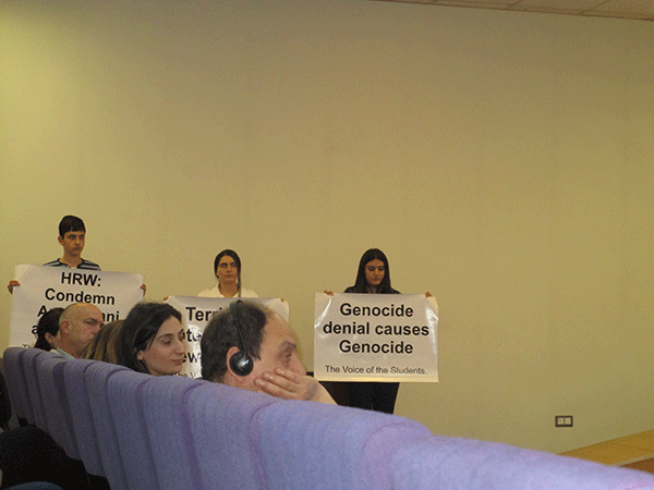 Դասախոսության ժամանակ մի խումբ ուսանողներ՝ ձեռքերին պաստառներ «Դադարեցրեք թուրքական ֆաշիզմը», «Ցեղասպանության ժխտումը ցեղասպանության պատճառ է դառնում», «Հայերի կյանքերը կարեւոր են», «HRW (Humans Rights Watch) դատապարտի՛ր Ադրբեջանի ագրեսիան» գրություններով, ներս մտան դահլիճ, եւ լուռ կանգնեցին: