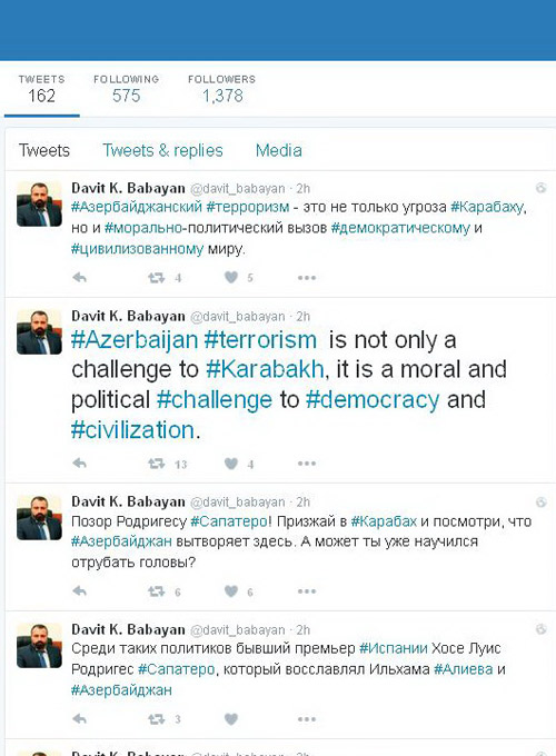 Սապատերոյին Թվիթերյան գրառմամբ պատասխանել է ԼՂՀ նախագահի խոսնակ Դավիթ Բաբայանը. «Քաղաքագետները, որ սնվում են խավիարով, իսկ գրպանները լցնում նավթի եկամուտներով ու գովերգում բռնակալներին՝ ամենավտանգավոր ահաբեկիչներն են»։