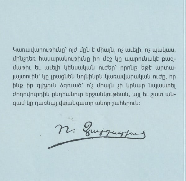 Առանց այս սկզբունքին՝ երկիր մը չի կրնար ինքզինք սահմանադրական դաւանիլ եւ խաղաղ աշխատութեան նուիրել»,- գրում է Զարդարյանը: