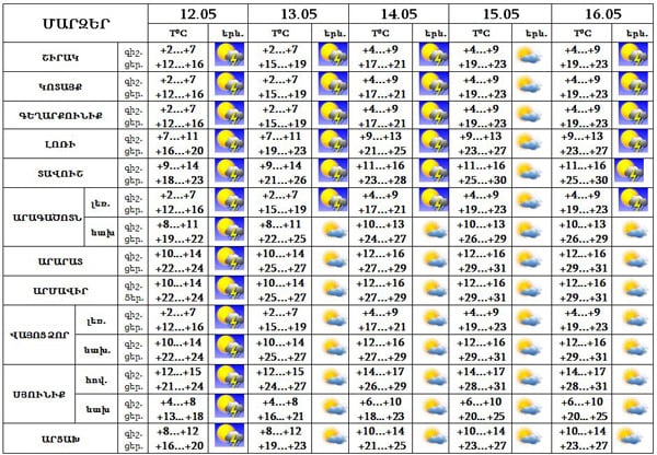 Մայիսի 12-ին առավելապես օրվա երկրորդ կեսին և գիշերվա առաջին կեսին սպասվում է կարճատև անձրև և ամպրոպ, ամպրոպի ժամանակ‵ քամու ուժգնացում‵ 15-17մ/վրկ: 13-14-ը, 16-ին երեկոյան ժամերին հնարավոր է ամպրոպ, անձրևի հավանականությունը փոքր է: