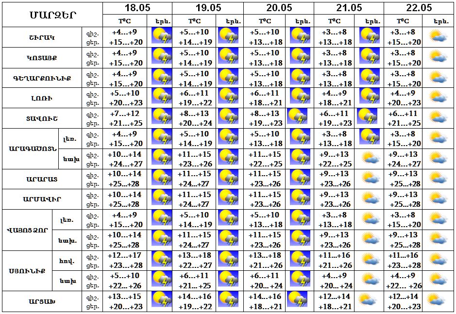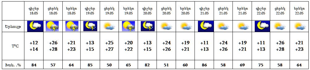 Մայիսի 18-20-ը սպասվում է կարճատև անձրև և ամպրոպ, ամպրոպի ժամանակ‵ քամու ուժգնացում‵ 15-17 մ/վ: 21-ին՝ երեկոյան ժամերին, հնարավոր է ամպրոպ, անձրևի հավանականությունը փոքր է: Մայիսի 22-ին սպասվում է առանց տեղումների եղանակ: