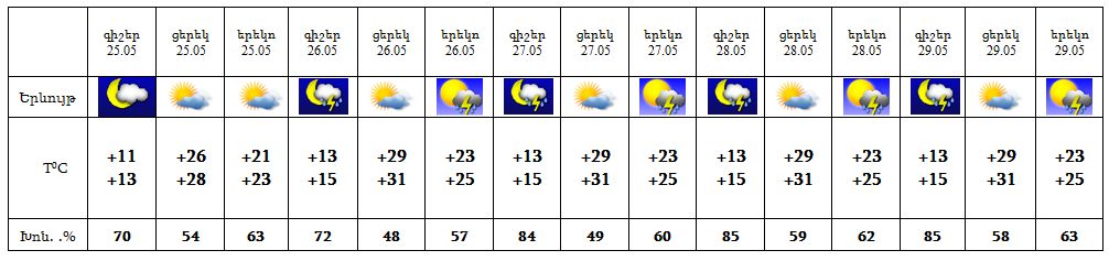 Մայիսի 25-ի երեկոյան ժամերին սպասվում է ամպրոպ, կա կարճատև անձրևի հավանականություն, 26-29-ի գիշերվա առաջին կեսին և երեկոյան ժամերին սպասվում է կարճատև անձրև և ամպրոպ, ամպրոպի ժամանակ` քամու ուժգնացում` 15-20 մ/վ: