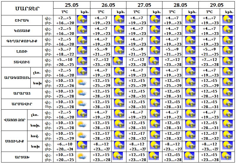 Մայիսի 25-ին առանձին շրջաններում, 26-29-ը` գիշերվա առաջին կեսին և օրվա երկրորդ կեսին, շրջանների մեծ մասում սպասվում է կարճատև անձրև և ամպրոպ, 26-29-ը առանձին հատվածներում հնարավոր է կարկուտ: