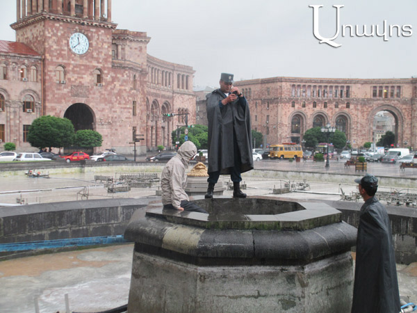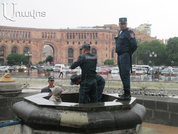 Աննա Շահնազարյանին այսօր էլ 2 ոստիկաններ փորձում էին դուրս հրավիրել ջրավազանից, նրանց անհաջող փորձերից հետո մի խումբ ոստիկաններ բռնելով Շահնազարյանի ոտքերից եւ ձեռքերից, հակառակ իր կամքին, դուրս հանեցին շատրվանների շրջանակաձեւ ավազանից :
