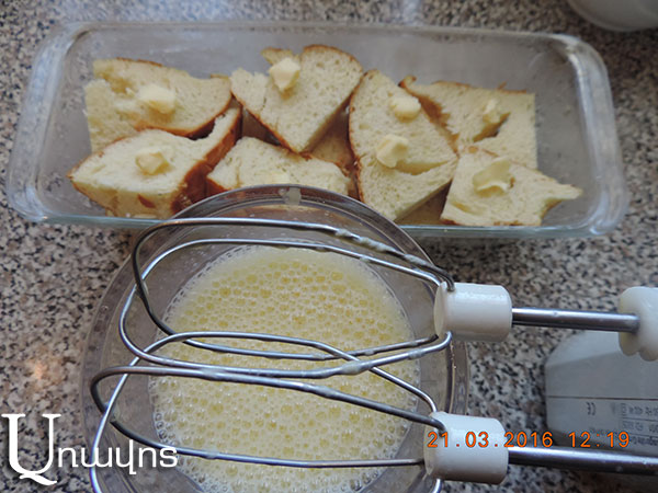 Հացը կամ բուլկին կտրատեք ձեր ցանկացած ձեւով՝ հավասար շերտերի կամ փոքր կտորների: Առանձին հարեք ձուն, շաքարավազը եւ կաթը, ավելացնելով վանիլի մզվածքը կամ փոշին: