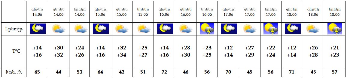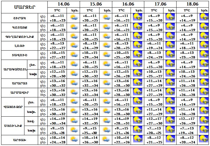 Հունիսի 14-15-ը սպասվում է առանց տեղումների եղանակ: 16-18-ը ժամանակ առ ժամանակ սպասվում է կարճատև անձրև և ամպրոպ, ամպրոպի ժամանակ‵ քամու ուժգնացում‵ 15-20 մ/վ արագությամբ: