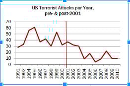 « 9/11. տասը տարի անց» զեկույցը ցույց է տալիս, որ սեպտեմբերի 11-ից հետո ԱՄՆ–ում ահաբեկչական հարձակումների թիվը կտրուկ նվազել է` հիմնականում շնորհիվ խիստ կանոնակարգերի, թարմացված օրենսդրության, հետազոտական կենտրոնների ստեղծման և այլն: Սակայն, ինչպես արդեն նշվեց, ահաբեկչությունը զոհերի և թիրախների համատեքստում հիմնականում հակաարևմտյան չէ, իսկ իրավիճակն ԱՄՆ–ից և Եվրոպայից դուրս իրականում շատ ավելի վատ է։