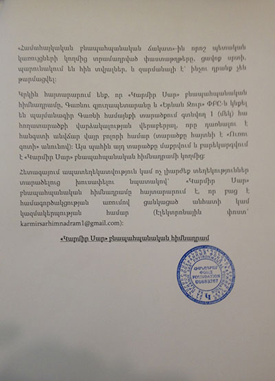 Սույն թվականի մայիսի 21-ին «Կարմիր Սար» բնապահպանական հիմնադրամը, ի պատասխան մայիսի 18-ին «Համահայկական բնապահպանական ճակատ» քաղաքացիական նախաձեռնության կողմից հրապարակված «Ազատ գետը, Համաշխարհային բանկի վարկը, պաշտոնյաների հողատարածքներն ու կոռուպցիան» վերտառությամբ հոդվածի, հայտարարություն էր տարածել, որով հերքել էր վերոհիշյալ հոդվածում տեղ գտած ապատեղեկատվությունը: