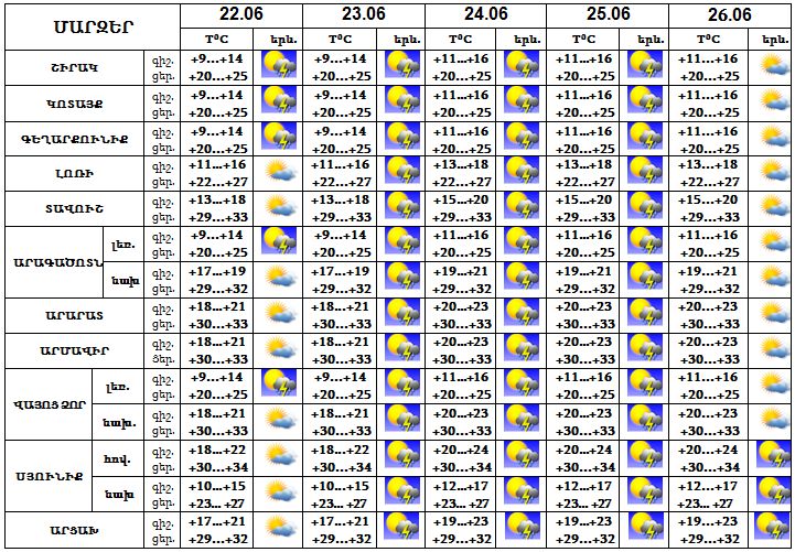 Հունիսի 22-ին առանձին շրջաններում, 23-25-ը շրջանների մեծ մասում, 26-ին հարավ արևելյան շրջաններում` գիշերը և օրվա երկրորդ կեսին, սպասվում է կարճատև անձրև և ամպրոպ, առանձին հատվածներում հնարավոր է կարկուտ: