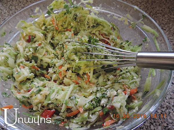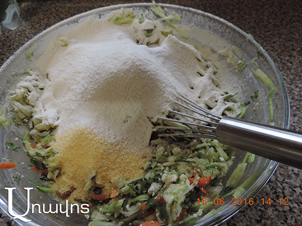 Կանաչիները եւ բանջարեղենը լավ լվանալ: Մանր կտրատել սոխը, թարմ պղպեղները, սխտորը, կանաչին: Խոշոր անցքերով քերիչով քերեք գազարն ու դդմիկը: Դդմիկը քերելուց հետո ձեռքերով լավ քամեք, որպեսզի որքան հնարավոր է՝ ջրազրկվի: