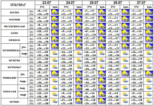 Հուլիսի 23-ին, 26-27-ը առավելապես հյուսիսային շրջաններում, 24-25-ը շրջանների մեծ մասում` երեկոյան ժամերին, սպասվում է կարճատև անձրև և ամպրոպ: