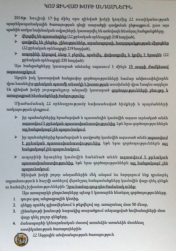 ՀՀ ոստիկանության հասարակայնության հետ կապերի եւ լրատվության վարչության պետ Աշոտ Ահարոնյանը հրապարակել է ԱԱԾ կոչը, հավելելով. «Այսօր ՊՊԾ գնդում գտնվողներին հասանելի է եղել հետեւյալ բովանդակությամբ կոչը»: