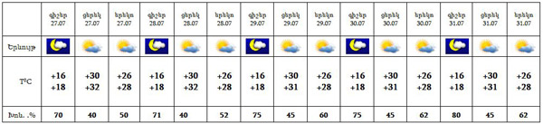 27-ին սպասվում է առանց տեղումների եղանակ: 28-31-ը` երեկոյան ժամերին, սպասվում է ամպրոպ, անձրևի հավանականությունը փոքր է: