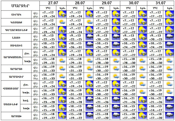 27-31-ը շրջանների մեծ մասում` հատկապես կեսօրից հետո, սպասվում է կարճատև անձրև և ամպրոպ, ամպրոպի ժամանակ‵ քամու ուժգնացում‵ 15-20 մ/վ արագությամբ: