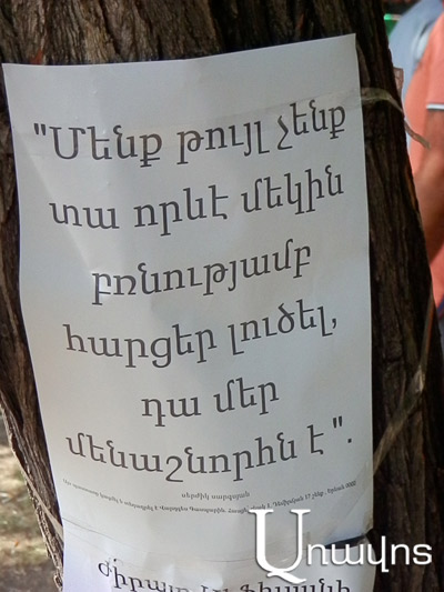 Այս պահին Խորենացի փողոցում մոտ երեք տասնյակ մարդ կա: Մարդկանց նյարդերը լարված են ու ժամանակ առ ժամանակ միմյանց չեն հասկանում, ամեն բառը մի անհատի կամ փոքրիկ խմբի վրա այսպես ասած սադրանքի տպավորություն է ստեղծում:
