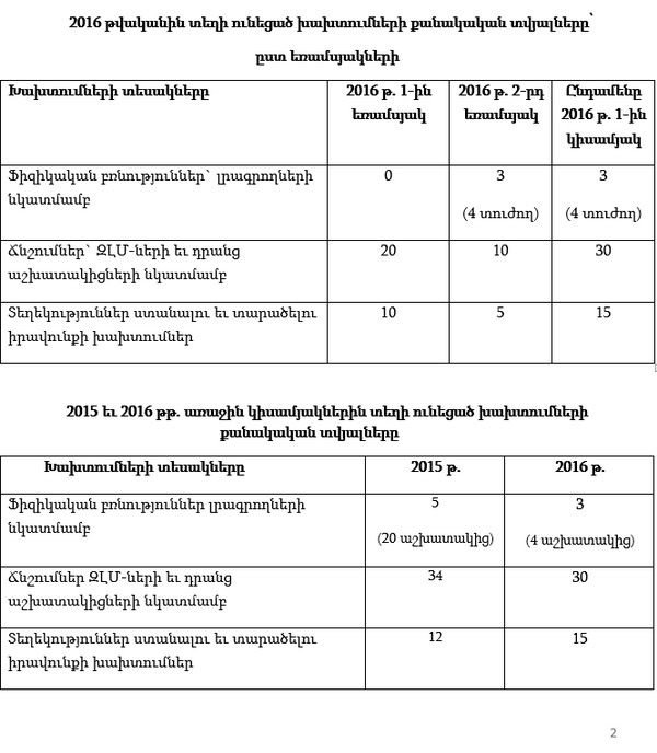 Երկրորդ եռամսյակում, ինչպես եւ նախորդում, առաջընթաց չգրանցվեց 2015 թվականի հունիսի 23-ին Երեւանի Բաղրամյան պողոտայում լրագրողների եւ օպերատորների նկատմամբ ֆիզիկական բռնությունների ու մասնագիտական գործունեությունը խոչընդոտելու փաստերով հարուցված քրեական գործում։ Նախաքննությամբ տուժող են ճանաչվել տարբեր ԶԼՄ-ների 21 լրագրող եւ օպերատոր, սակայն իրադարձություններից մեկ տարի անց գործով որեւէ մեղադրյալ կամ կասկածյալ չկա։ Ի տարբերություն սրա՝ 2015 թ. դեկտեմբերի 6-ին՝ Սահմանադրական փոփոխությունների հանրաքվեի օրը, «Հետք» ինտերնետային կայքի լրագրող Դիանա Ղազարյանի եւ «Ազատություն» ռադիոկայանի լրագրող Անուշ Մկրտչյանի մասնագիտական գործունեությունը խոչընդոտելու դեպքերով հարուցված քրեական գործերն ուղարկվել են դատարան։