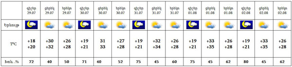 Հուլիսի 29-ից օգոստոսի 2-ը` երեկոյան ժամերին, սպասվում է ամպրոպ, անձրևի հավանականությունը փոքր է: