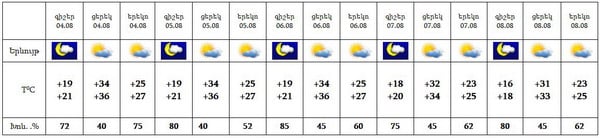 4-8-ը` երեկոյան ժամերին, առանձին հատվածներում հնարավոր է կարճատև անձրև և ամպրոպ: