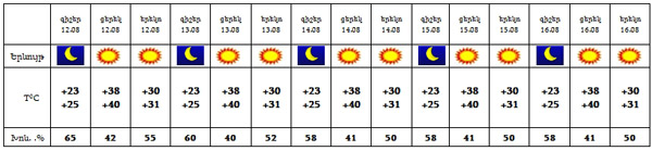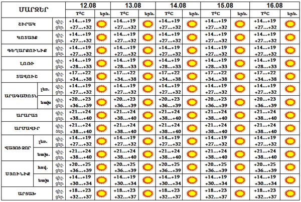 Օգոստոսի 12-16-ը հանրապետությունում սպասվում է բարձր ջերմային ֆոն և բարձր կարգի հրդեհավտանգ իրավիճակ: Խորհուրդ է տրվում խուսափել արևի ուղիղ ճառագայթներից և ֆիզիկական ակտիվությունից: