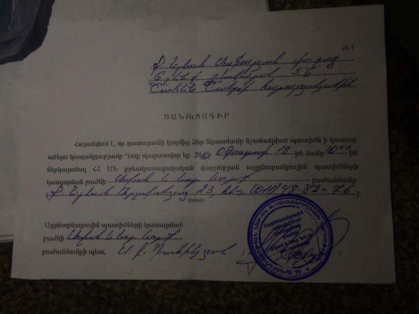 Շանթ Հարությունյանի որդուն՝ Շահեն Հարությունյանին, ոստիկանությունը ծանուցագիր էր ուղարկել, որտեղ նշում էր, որ իր նկատմամբ նշանակված պատիժը ի կատար ածելու կապակցությամբ նա պարտավոր է օգոստոսի 18-ին, ժամը 10-ին ներկայանալ ալյընտրանքային պատիժների կատարման բաժին: