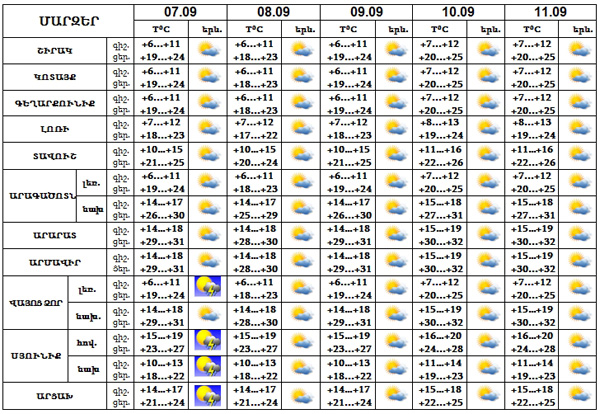 Սեպտեմբերի 7-ի երեկոյան ժամերին հարավ-արևելյան շրջաններում սպասում է կարճատև անձրև և ամպրոպ, առանձին հատվածներում հնարավոր է կարկուտ, 8-11-ը սպասվում է առանց տեղումների եղանակ: