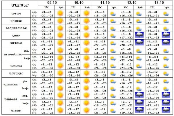 Հոկտեմբերի 9-11-ը սպասվում է առանց տեղումների եղանակ, 12-13-ը՝ Լոռիում, Տավուշում, Սյունիքում և Արցախում սպասվում է անձրև: