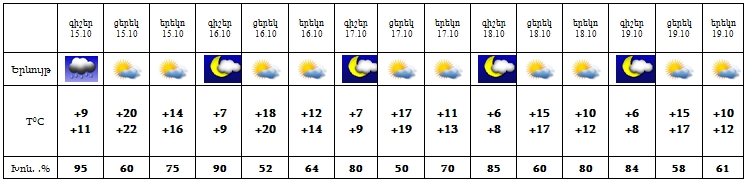 Հոկտեմբերի 15-ի գիշերը շրջանների զգալի մասում, ցերեկը Վայոց ձորում, Սյունիքում և Արցախում, 17-19-ը Լոռիում, Տավուշում, Սյունիքում և Արցախում, սպասվում է անձրև: 16-ին սպասվում է առանց տեղումների եղանակ:
