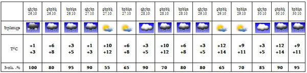 Օդի ջերմաստիճանը 26-ին կնվազի 4-5, 27-29-ն աստիճանաբար կբարձրանա 2-4 աստիճանով: