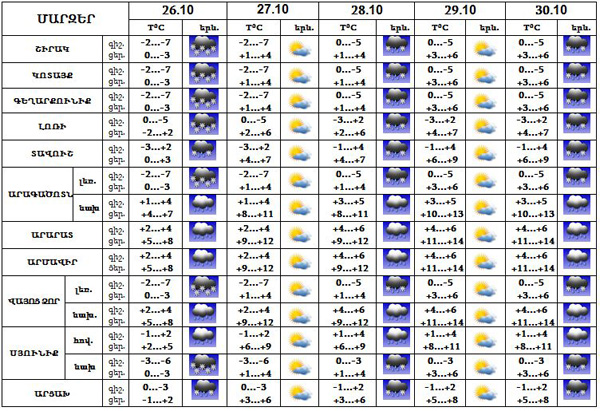 Հոկտեմբերի 26-ին, 27-ի գիշերը, 28-ի ցերեկը, 29-ի գիշերը, 30-ի ցերեկը սպասվում է անձրև, 27-ի ցերեկը, 28-ի գիշերը, 29-ի ցերեկը և 30-ի գիշերը սպասվում է առանց տեղումների եղանակ: 26-ի գիշերը և առավոտյան առավել բարձրադիր հատվածներում սպասվում է թաց ձյուն: