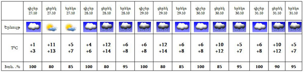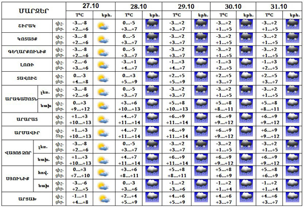 Հոկտեմբերի 27-ին, 28-ի գիշերը հանրապետությունում սպասվում է առանց տեղումների եղանակ: 28-ին կեսօրից հետո, 29-31-ը սպասվում են տեղումներ, լեռնային գոտիներում` թաց ձյուն: