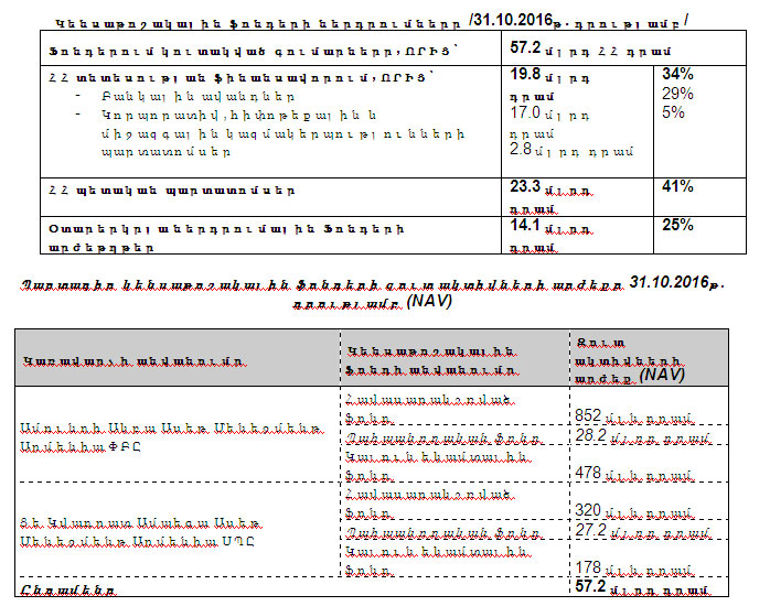 • Արժեթղթավորման հիմնադրամի արժեթղթեր: Պարտադիր կենսաթոշակային ֆոնդերի ակտիվներից 95 մլն դրամ ներդրում է կատարվել ՀՀ-ում առաջին անգամ իրականացված արժեթղթավորման պրոյեկտի միջոցով թողարկված պարտատոմսերում: Թողարկված պարտատոմսերի համար որպես ապահովություն հիմք են հանդիսացել 5 վարկային կազմակերպություններից ձեռք բերված վարկեր 1.2 մլրդ ՀՀ դրամ ընդհանուր ծավալով (թվով մոտ 600 հատ ՓՄՁ, գյուղատնտեսական և սպառողական վարկերը): Թողարկումն իրականացվեց 2015 թվականի դեկտեմբերին, իսկ 2016 թվականի հունվար ամսին ազդարարվեց այս պարտատոմսերի բորսայական առևտրի մեկնարկը: