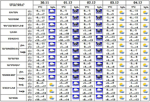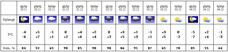 Նոյեմբերի 30-ին, դեկտեմբերի 3-ի ցերեկը, 4-ին սպասվում է առանց տեղումների եղանակ, դեկտեմբերի 1-2-ը, 3-ի գիշերը սպասվում են տեղումներ, բարձրադիր վայրերում‵ թաց ձյուն, ցածրադիր գոտիներում՝ ձնախառն անձրև: